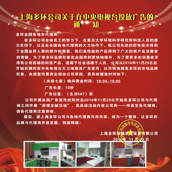 上海多環公司關于在中央電視臺投放廣告的通知